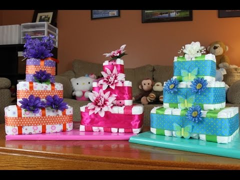 My Quick Square Diaper Cake Video Tutorial. I hope you like it! 108 Newborn Size Diapers 1 Roll 2-1/2 Inch Ribbon 1 Roll 1-1/2 Inch Ribbon 1 Small Wooden Dowel Tape Scissors Rubberbands Paper Clips Optional Accessories: Cloth Flowers Clip On Butterflies You Can also wrap each layer with a Receiving Blanket if you like.